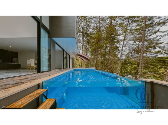 Piscina con pared de vidrio, diseño único para disfrutar del paisaje.